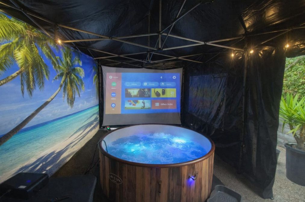 We need about 1.5 hours to setup a hot tub & cinema. We will setup and start filling with water, as well as add a new filter cartridge and chemicals.